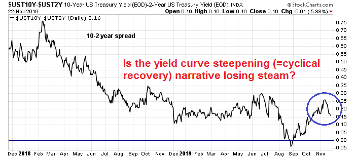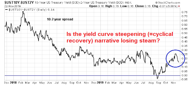 Just as everyone starts climbing on the bandwagon, the yield curve steepened, which is a signal that the bond market expects better growth, but flattened again back to roughly where it started.