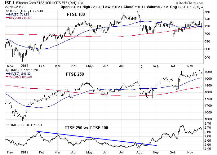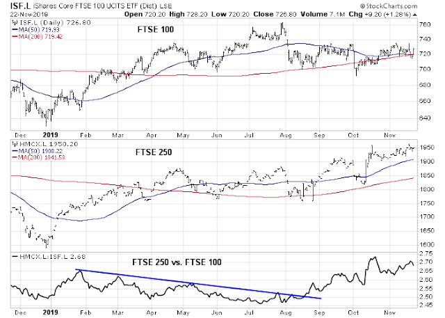 Turning to Europe, this region is becoming the bright spot of global risk appetite. In the UK, the risk of a disorderly no-deal Brexit is rapidly fading. We can see the Brexit risk premium fading in the chart of the FTSE 100, which is composed of large cap and global companies, and the smaller cap and more domestically sensitive FTSE 250. The bottom panel shows the ratio of the FTSE 250 to FTSE 100, which broke out of a relative downtrend in August and it has been rising ever since. This is a signal that it expects an improvement in outlook for companies sensitive to the domestic UK economy.