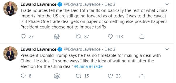 The markets took further fright based on Trump’s comment that he had no timetable for a trade deal with China, and he was willing to wait until after the 2020 election to conclude an agreement. More importantly, Edward Lawrence of Fox Business reported that there are no current plans to delay the next round of tariffs scheduled for December 15, which is an unanticipated development as the market consensus was they would be delayed.
