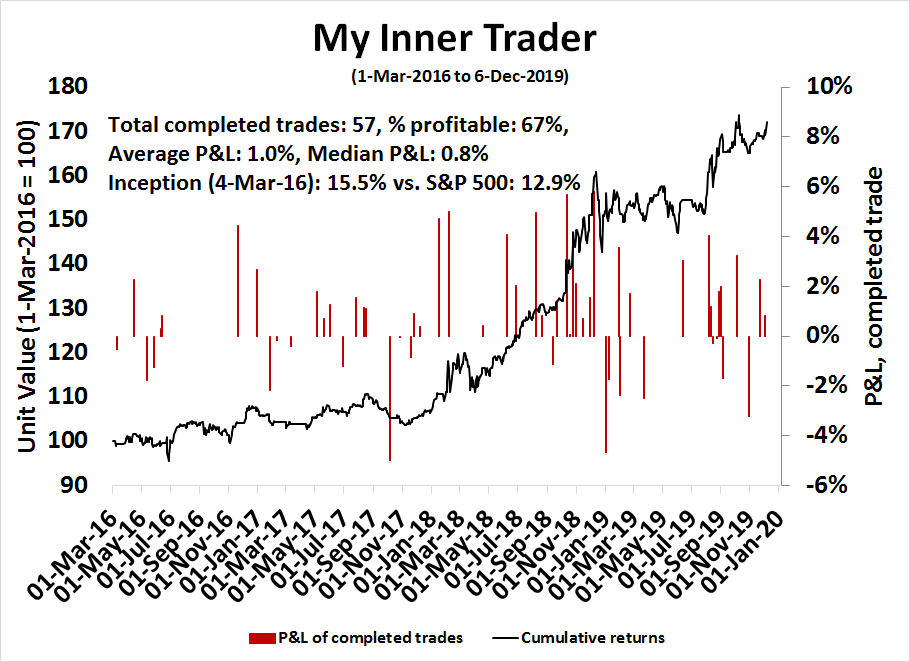 My inner trader uses a trading model, which is a blend of price momentum (is the Trend Model becoming more bullish, or bearish?) and overbought/oversold extremes (don’t buy if the trend is overbought, and vice versa). Subscribers receive real-time alerts of model changes, and a hypothetical trading record of the those email alerts are updated weekly here. The hypothetical trading record of the trading model of the real-time alerts that began in March 2016 is shown below.