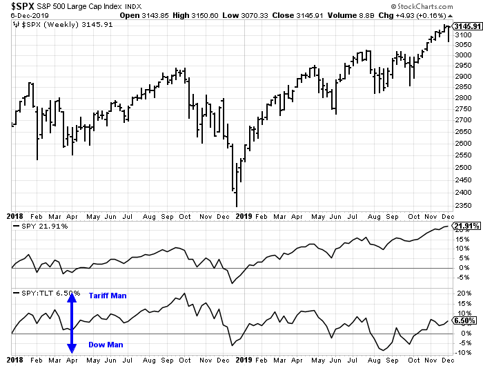 What does that mean for stock prices? The empirical evidence says, “Not much.” SPY has risen about 22% on an unannualized basis during that period. The bottom panel of the chart shows the relative returns of SPY relative to long Treasuries (TLT), and stocks are still ahead of bond by 6.5%. A strong SPY to TLT ratio gives room for Trump’s Tariff Man persona to be dominant, as he will believe the market and economy are strong enough for him to flex his economic muscles. By contrast, a weak SPY to TLT ratio will cause the Dow Man persona to emerge, as Trump has shown himself to view the stock market to be a barometer of his Presidency.
