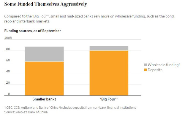 A recent WSJ article highlighted some of the woes of the Chinese banking system, much of which are concentrated in the smaller banks. During China’s hyper-growth period, there have been thousands of smaller local banks controlled by local politicians that were being used for their pet projects. These banks relied much more on wholesale funding than on retail deposits. If it were not for the implicit government guarantees, many of these small local banks would have collapsed a long time ago. Beijing’s preferred solution is to merge the bad banks, as they appear, with stronger large banks. But this sets up a Japanese 1990’s problem of bank zombification – which was the catalyst for the start of Japan’s Lost Decades.