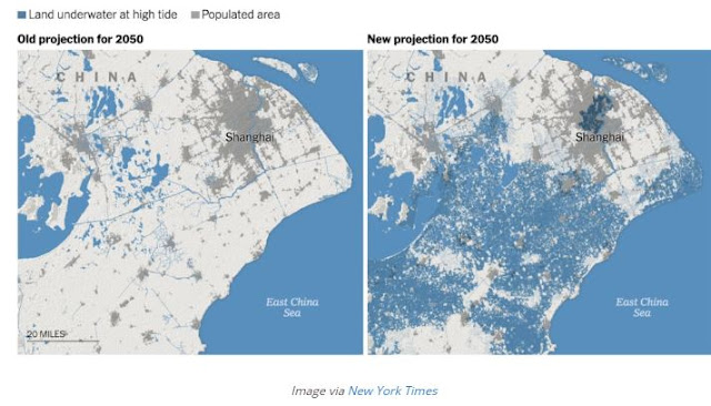 Another potential threat to the Chinese growth engine may come from climate change. A new study published in Nature Communications revealed that a new study indicates rising sea levels from climate change means the coastlines are three times more exposed than previously thought, and China accounts for 15-28% of the total population threatened by rising sea levels, Especially at risk is Pearl River Delta (Guangzhou and Shenzhen) and Shanghai. These models project that most of Shanghai may be under water by 2050.