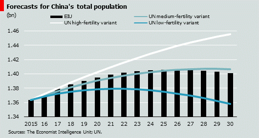 China’s population may even age faster than these projections. These estimates are based on the standard assumption that the fertility rate rises from the current rate of 1.6 to 1.7-1.8 live births per woman. New estimates from The Economist’s Economic Intelligence Unit the fertility rate is far lower than initially thought, and “peak population comes four years sooner that the UN’s baseline ‘medium-fertility’ variant”.