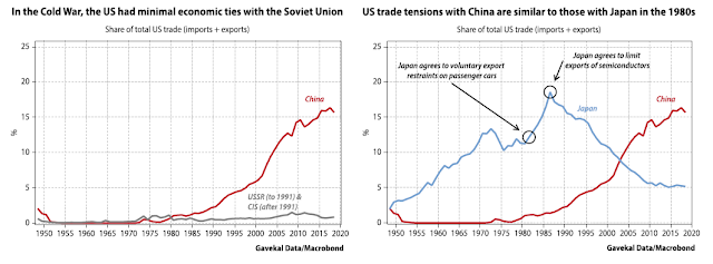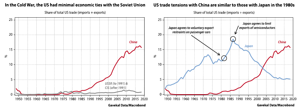 There are still reasons to be optimistic. The US-China relationship is still deep and difficult to unwind. John Authers recently highlighted analysis comparing the degree of integration of the Soviet Union and China to the global economy. China is not the Soviet Union, and any Cold War style containment will be difficult.