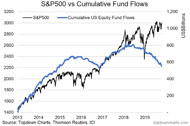 In addition, long-term measures of retail sentiment are showing signs of caution. Callum Thomas of Topdown Charts that cumulative equity fund flows are in a downtrend, which is contrarian bullish.
