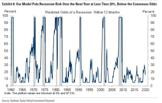While the short-term outlook appears dark, here is the good news. The equity bull market is still alive from a long-term perspective. There is no sign of a recession on the horizon. CNBC reported that Goldman Sachs is saying the economy is nearly recession proof. Goldman’s recession model shows recession risk is below 20%, and falling.