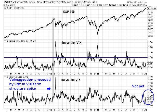 Friday’s market reaction to the Soleimani news was also a little anomalous. Rising geopolitical tensions should see risk premiums spike, and the VIX term structure invert. Even the Volmageddon of February 2018 saw the 9-day to 1-month VIX term structure (bottom panel) invert, followed by the inversion of the 1-month to 3-month VIX ratio (middle panel). Today, the 9-day to 1-month VIX spiked but did not invert, and the 1-month to 3-month VIX barely budged from levels that can be best described as market complacency.