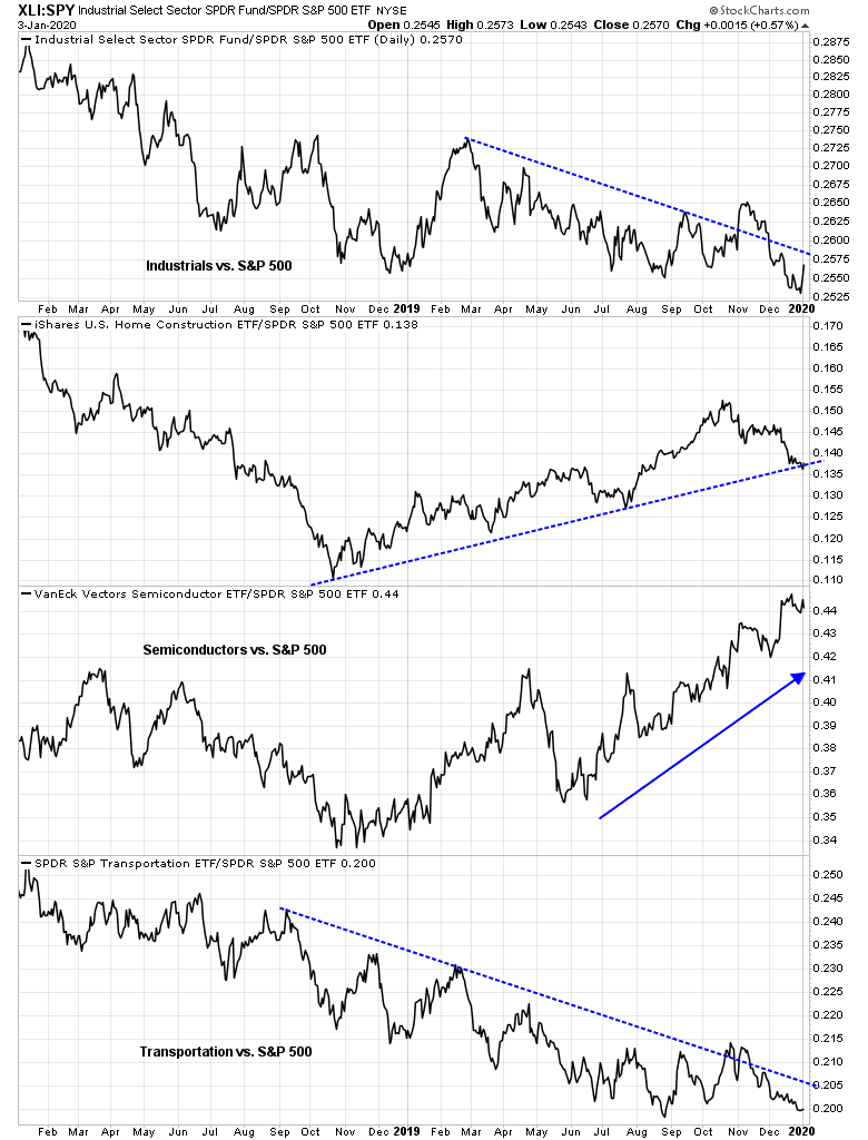 A similar picture of cyclical weakness is developing from a global perspective. Semiconductors remain the leadership, but global industrial and auto stocks are weakening and showing signs of sideways relative consolidation.