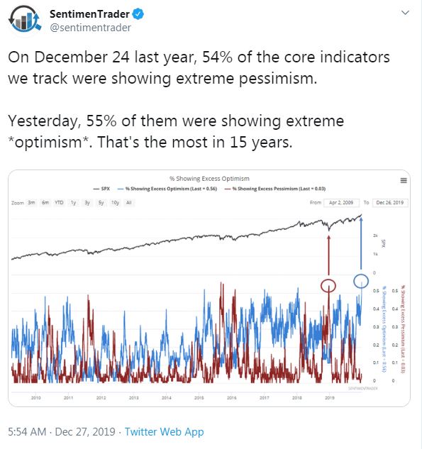 SentimenTrader documented how his sentiment models had reached historically high levels that even exceeded the melt-up high of January 2018.