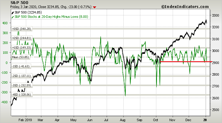On the other hand, the technical structure of the market does not support an immediate pullback. Both the melt-up top of early 2018 and the top of 2019 were accompanied by negative NYSI divergences. So far, we have only seen NYSI reach an overbought level, but no negative divergence as the market moved high and NYSI failed to reach new highs.