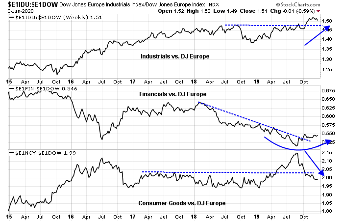 In Europe, the cyclical bull is still alive. Mid-cycle cyclical stocks, such as industrial and financial companies, are consolidating after breaking out of relative downtrends. Defensive stocks, such as consumer goods, are in relative downtrends.