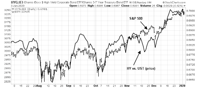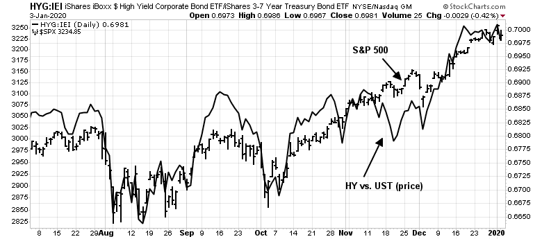 Cross-asset signals presents a mixed picture. The relative performance of high yield (junk) bonds to duration-equivalent Treasuries are not showing neither positive nor negative divergences.