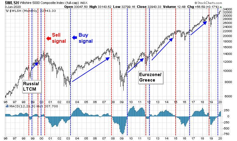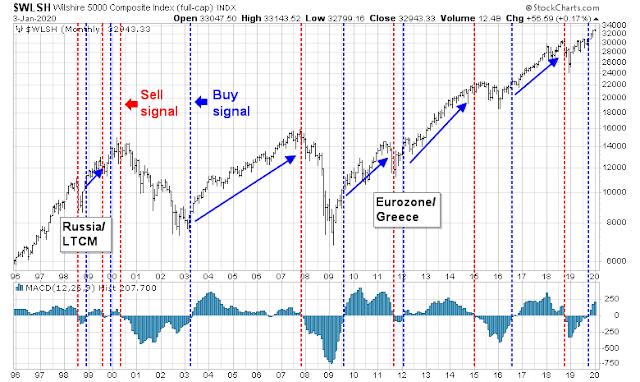 We maintain several market timing models, each with differing time horizons. The “Ultimate Market Timing Model” is a long-term market timing model based on the research outlined in our post, Building the ultimate market timing model. This model tends to generate only a handful of signals each decade.