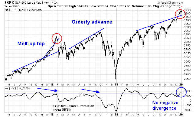 What should traders and investors do? If we were to use the late 2017 and early 2018 episode as a template, there are definite indications that the market has overrun its rising trend line and a soaring net new highs to lows, which are signs of a melt-up. By comparison, the advance in the summer of 2018 was far more orderly. From a technical perspective, there are not the same warnings of an imminent market top that we saw in early 2018. In January 2018, the market broke down without any negative RSI divergences, but did see a negative NYSI divergence. Today, there are neither RSI nor NYSI negative divergences, which could mean that this rally has more room to run.