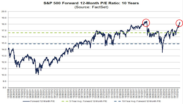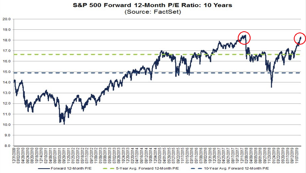 Valuations are also becoming stretched. Data from FactSet shows that the market’s forward P/E is at 18.3, which is nearly the same level seen at the melt-up peak of early 2018.
