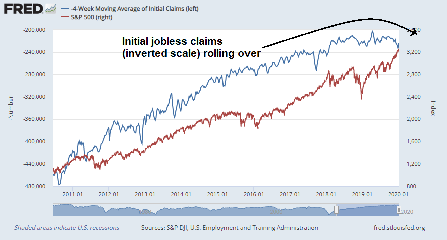 In addition, Friday’s weakish Jobs Report highlights the market vulnerability to weakening employment. Initial jobless claims has been inversely correlated to the SPX during this expansion cycle, but initial claims (blue line, inverted scale) are rolling over while stock prices (red line) continue to rise. How long can this negative divergence last?