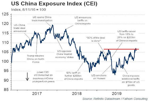 Fathom’s China Exposure Index (CEI), which measures the performance of US-listed firms that do business in China against their domestic peers, is already at highly elevated levels. What could possibly go wrong?