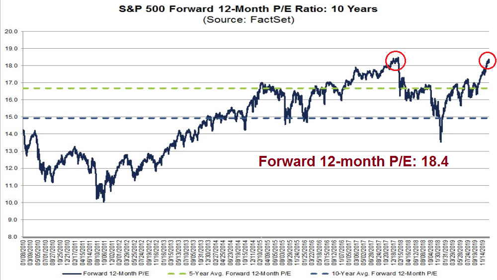 As the market advanced to another fresh high, the forward P/E rose to 18.4, which roughly matches the level last seen at the melt-up high of early 2018.
