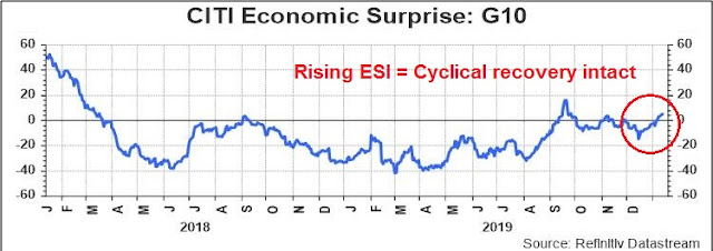 Looking further ahead, I believe that this market is only facing a correction, and not a bear market. Despite the recent setback suffered by cyclical stocks, top down macro indicators of a global cyclical rebound The Global Economic Surprise Index is still rising, indicating more positive than negative economic surprises.