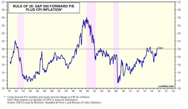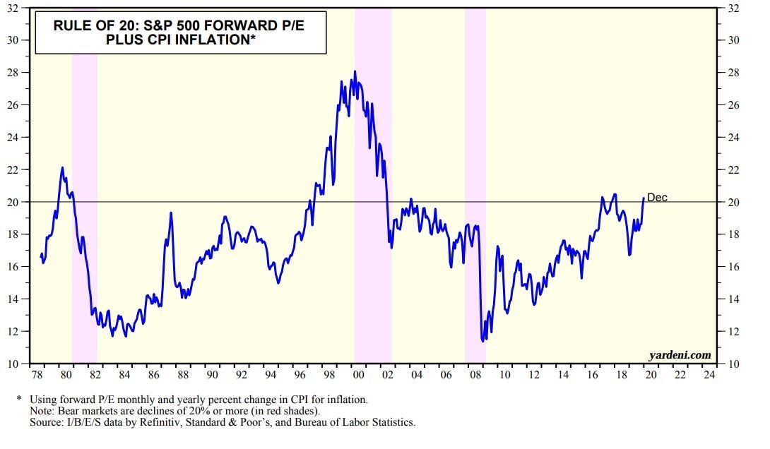 The Rule of 20, which raises a warning flag whenever the sum of the market P/E and inflation rate exceeds 20, is coming into play.