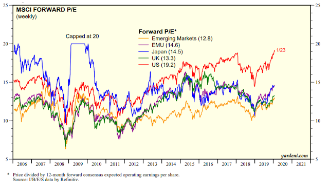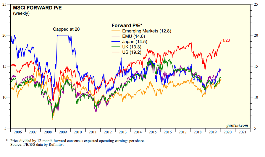 However, investors can find cheaper valuations outside the US. While the forward P/E of the US market is at nosebleed levels, developed market P/E ratios are more reasonable at about 14, and EM equities is trading at a forward P/E of 12.8. In the short-term, however, I would avoid EM because of their exposure to China and the uncertainties associated with the coronavirus.