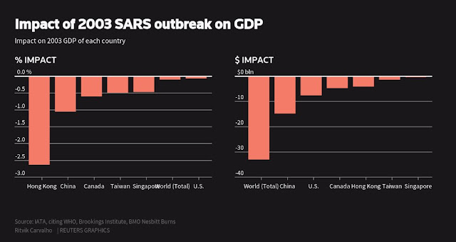 Since we are mostly in uncharted waters, a first order approximation of the effects to GDP growth is the SARS outbreak, whose effects were felt most acutely in Hong Kong, and the nearby Chinese province of Kwangtung.