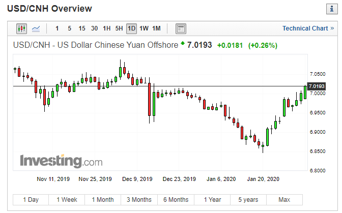 The USDCNH offshore yuan rate weakened past the 7 to 1 level.