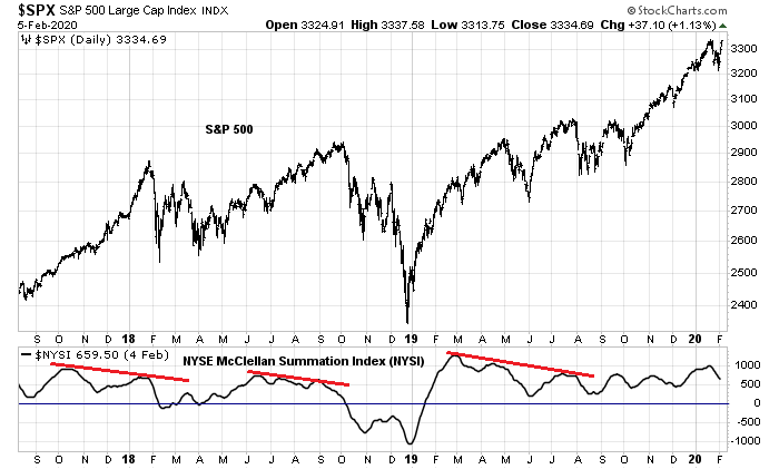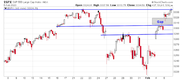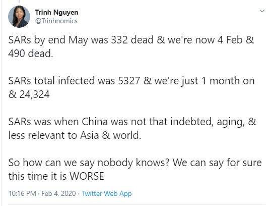 I had set out one line in the sand (see A key test: The Zero Hedge bottom?) of the market might react to news. Notwithstanding the Iowa caucus debacle, in which the results are not fully known yet two days after the event, the market is rallying in the face of news of more uncontrolled spread of the coronavirus. Trinh Ngyugen at Natixis pointed out that this virus is worse than SARS at this point in the outbreak, based on the figures coming out of China.