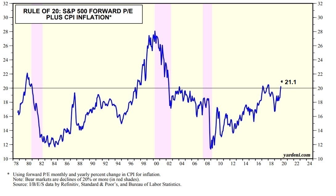 While such a sentiment backdrop could underpin a FOMO buying stampede, the S&P 500 is now trading a forward P/E ratio of 18.8. The Rule of 20 Indicator, which flashes a warning when the sum of the forward P/E and CPI inflation rate exceeds 20, is now at a worrisome bull cycle high of 21.1.
