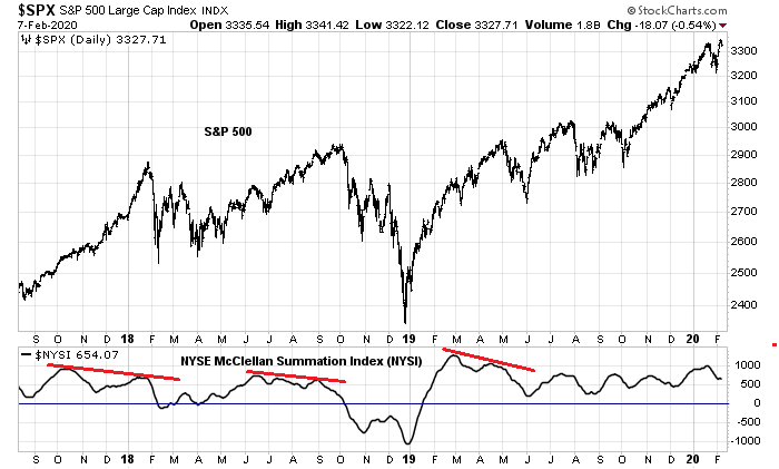Should the animal spirits return and drive stock prices upward, watch for fresh highs accompanied by a negative divergence in the NYSE McClellan Summation Index (NYSI). Similar divergences were in evidence at the last two major market highs. Advances under such a “false rally” scenario in the past two tops saw a three-month gap between the first NYSI high and the final stock market top. If the past is any guide, this would put timing of the next major top in April.