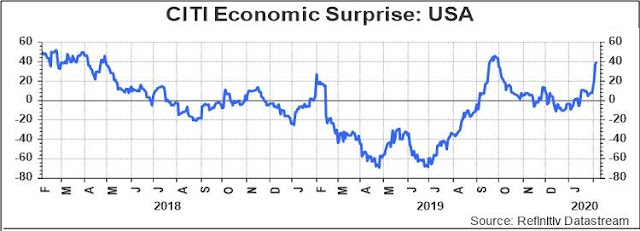 The picture outside China has been mixed to positive. The pre-outbreak macro outlook has been mostly positive, as evidenced by the upside surprise in both ISM Manufacturing and Services. The Citigroup Economic Surprise Index, which measures whether economic data is beating or missing expectations, has been surging.