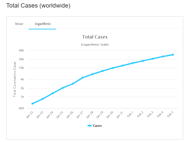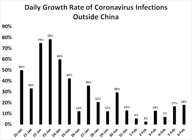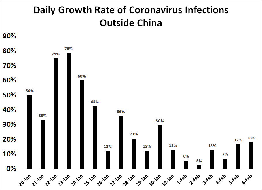 There is another solution if you don’t trust Chinese statistics. The Johns Hopkins CSSE website breaks out the growth rate outside China. While the history of the data is short it’s still early, the growth rate has been relatively steady, and results are inconclusive.