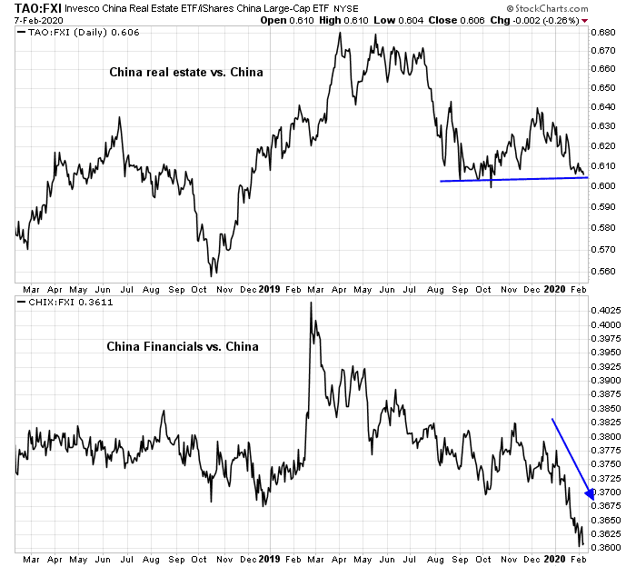 In response to the nervousness over the economic slowdown, the PBOC has unleashed a shock-and-awe liquidity campaign on the financial system. This has put a floor on stock prices, but market internals are mixed. The highly cyclical real estate industry, whose sales have cratered to zero during the outbreak, has seen its relative returns lag the market, but it is stabilizing at a relative support level. By contrast, the relative performance of banking stocks have been plummeting, indicating heightened concerns over financial system stability.