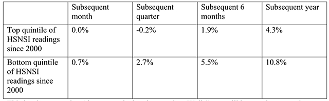 The stock market advance appears to be unsustainable on an intermediate term basis, but even Hulbert’s analysis shows a return of 0.0% over one month, which is hardly a wildly bearish forecast. The bigger question is, how vulnerable is the market in the short run?