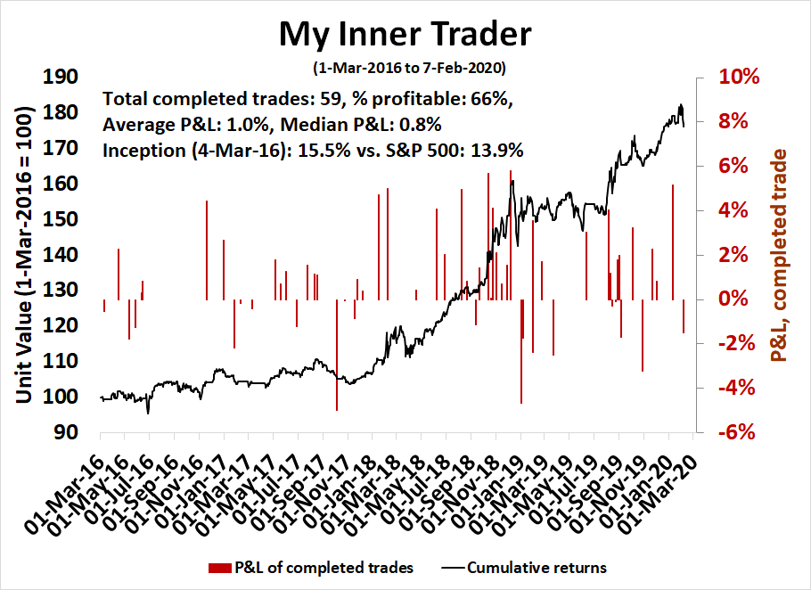 My inner trader uses a trading model, which is a blend of price momentum (is the Trend Model becoming more bullish, or bearish?) and overbought/oversold extremes (don’t buy if the trend is overbought, and vice versa). Subscribers receive real-time alerts of model changes, and a hypothetical trading record of the those email alerts are updated weekly here. The hypothetical trading record of the trading model of the real-time alerts that began in March 2016 is shown below.