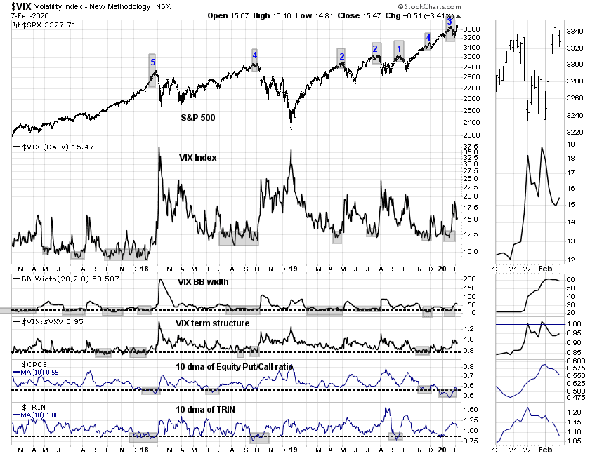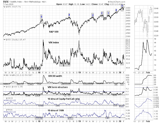 My own sentiment models, which are mainly based on market based and technical data, tell a different story. Fear levels, as measured by option trading, have spiked. In the past, market tops, which are shown in shaded grey, have seen at least one of the five models flash warning signs. Today we have none.