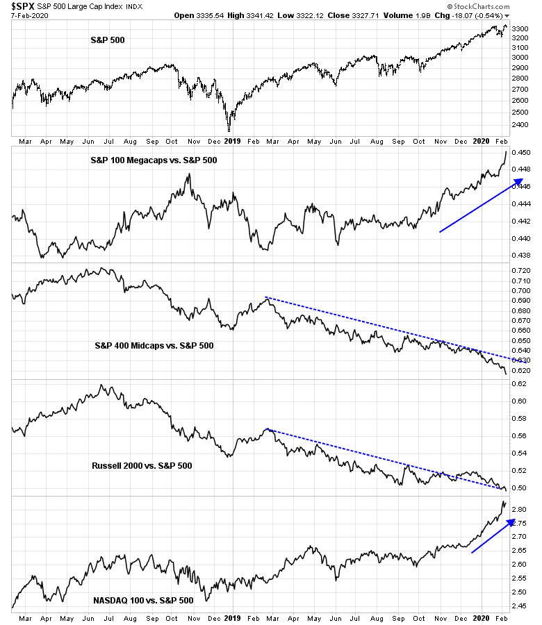 A review of market internals reveals a mixed picture. Market leadership by market cap band shows narrowing leadership by NASDAQ and megacap stops, while mid and small caps lag badly. Conventional technical analysis will conclude that this is not sustainable, and caution is warranted. In the short run, however, NASDAQ and megacaps have gone parabolic. In the words if the legendary technical analyst Bob Farrell, “Parabolic advances usually go further than you think, but they do not correct by going sideways.” The question is how much further does the parabolic move go?
