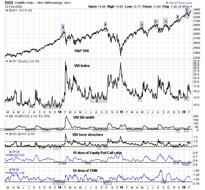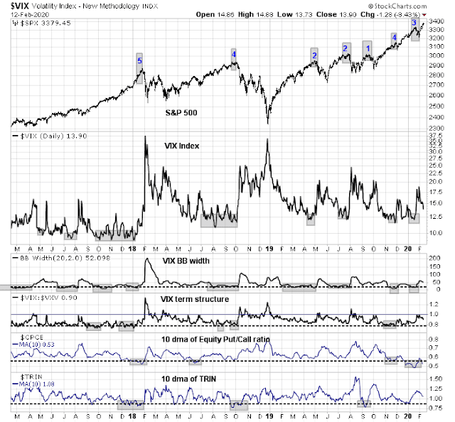 From a broader sentiment context, my suite of non-survey sentiment indicators do not reveal excessive bullishness other than the put/call ratio. In the past, short-term tops have been marked by these indicators flashing complacent readings, or near complacent readings. That does not seem to be the case today.
