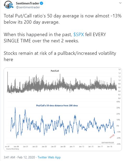 SentimenTrader also warned about the precarious and complacent state of the put/call ratio, which has always resolved with a market decline over the next two weeks. Some of the excess bullishness to retail buying of TSLA call options, which SentimenTrader referred to as a “speculative spigot”.