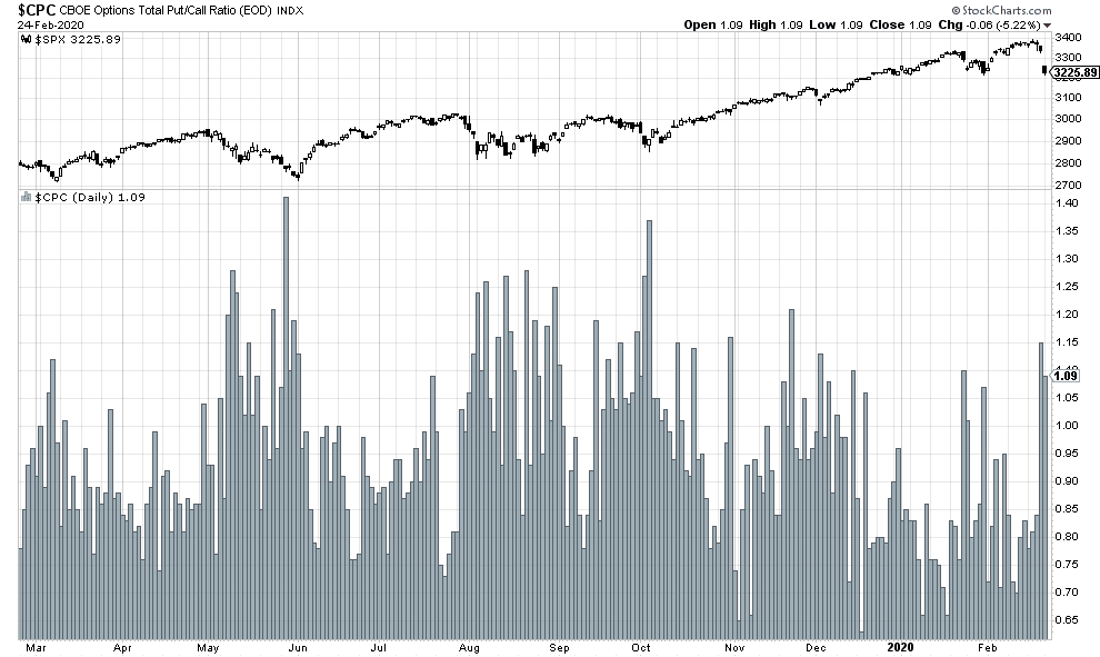 Option sentiment has also been very restrained during today’s sell-off. The CBOE put/call ratio rose to 1.09. While the reading is on the high side by historical standards, it seems unusual for a day when the stock market was down over -3%.