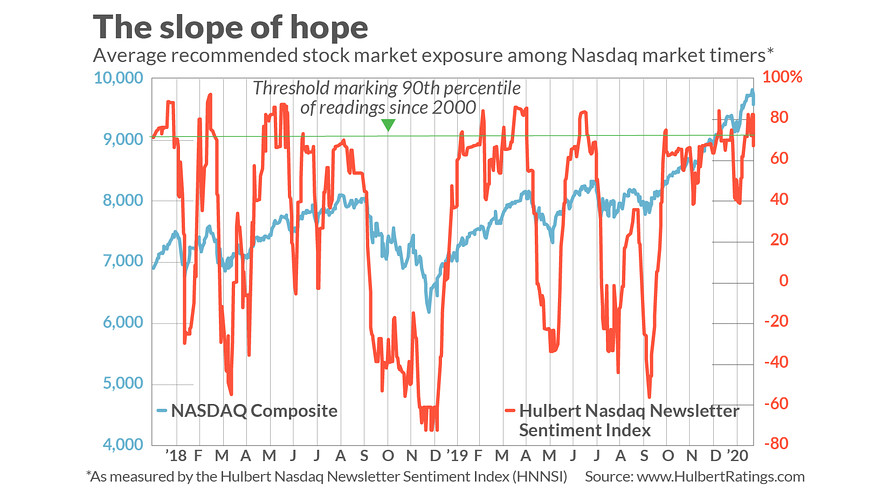 Mark Hulbert published an article this morning and by observing that his Hulbert Nasdaq Newsletter Sentiment Index had retreated from an over 90th percentile bullish reading to the 83rd percentile. That’s constructive, but hardly the sign of all-out capitulation.