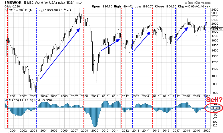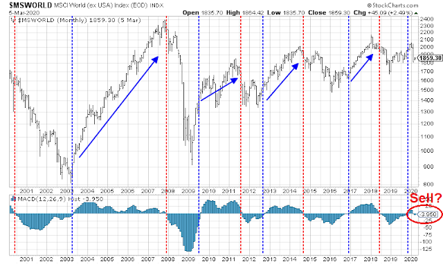 Is the bull on his last legs? It is starting to look that way. I alerted readers to an unconfirmed bullish monthly MACD buy signal in late July (see A (deceptive) long term buy signal). The buy signal was confirmed in late October by both the Wilshire 5000 and non-US markets (see Buy the breakout, recession risk limited). In the past, monthly MACD buy signals have usually been very effective and long lasting. The recent market downdraft has brought the indicator to the verge of a sell signal, indicating dying price momentum and the possible end of the bull phase. If the market were to end the month at these levels, the sell signal would be confirmed.