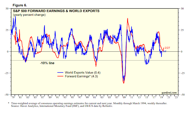 The chart of past earnings declines, recessions, and world exports puts the earnings declines into some context. This analytical framework is important because the coronavirus induced slowdown disrupts global supply chains, which puts downward pressure on exports. The last two recessions were historically atypical. The GFC of 2008 was a financial crash. The 2000 slowdown was caused by the bursting of the NASDAQ Bubble fueled by excessive speculation. You would have to go back to 1990-91 and 1981-82 to find more typical recessions. The 1990 experience was sparked by Saddam Hussein’s invasion of Kuwait, which caused an oil supply shock, and the 1982 period was the result of excessively tight monetary policy designed to squeeze inflationary expectations.