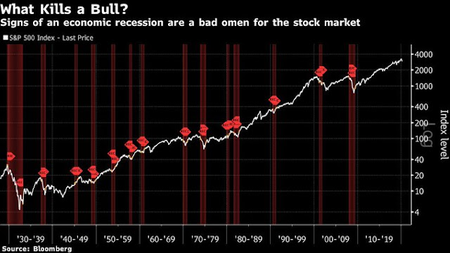 Recessions are bull market killers through two mechanisms. Corporate earnings fall in a recession, and stock prices fall further because of fears that lead to P/E compression.