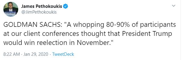 There is another bearish factor that investors should consider. Informal polls at a Goldman Sachs events in late January revealed that almost all participants expect Trump to be re-elected in November.