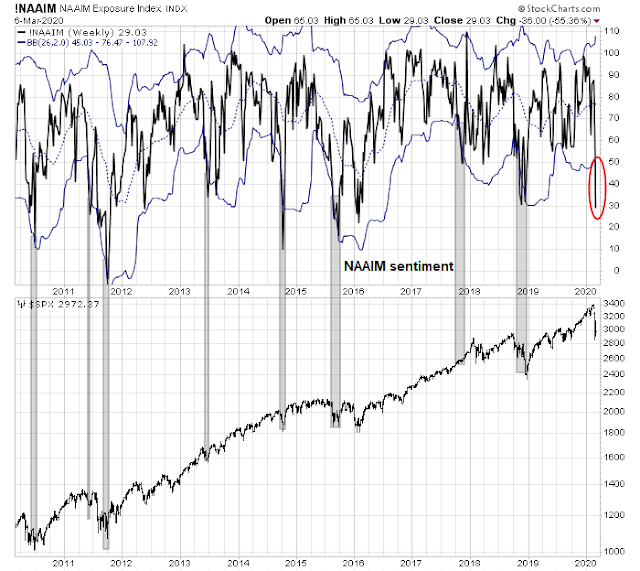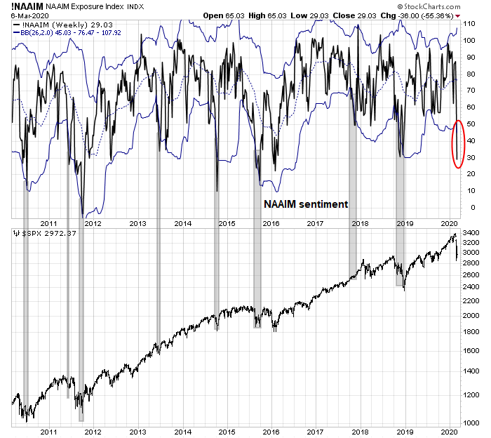 Sentiment buy signals are popping up everywhere. One useful sentiment indicator is the capitulation shown by the NAAIM Exposure Index, which measures the views of RIAs managing individual client funds. This index skidded below its 26-week Bollinger Band, which historically has signaled good bullish entry points to the stock market.