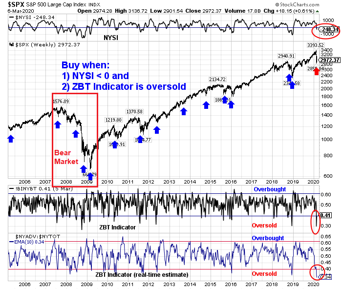 Here is how that scenario would play out in the context of my Ultimate Intermediate Bottom Spotting Model. This model flashes a buy signal whenever both the Zweig Breadth Thrust Indicator becomes oversold (check), and the McClellan NYSE Summation Index (NYSI) is negative (check). This model flashed four buy signals during the bear market of 2007-09. In each case, the market staged a relief rally, but the rally failed as stock prices retraced the gains to new lows in each of the cases.