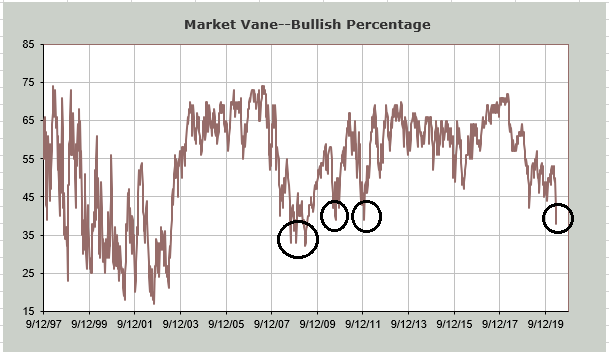 Similarly, Market Vane bulls has fallen to the levels last seen in 2010 and 2011. Readings were only exceeded by the market crash of 2008-09.