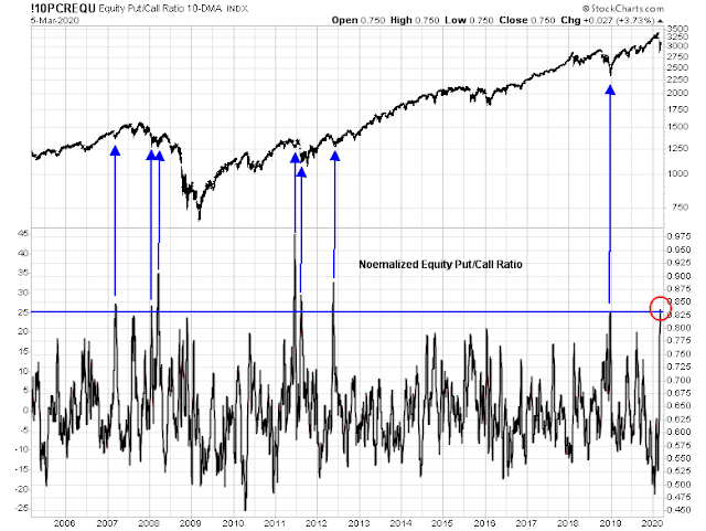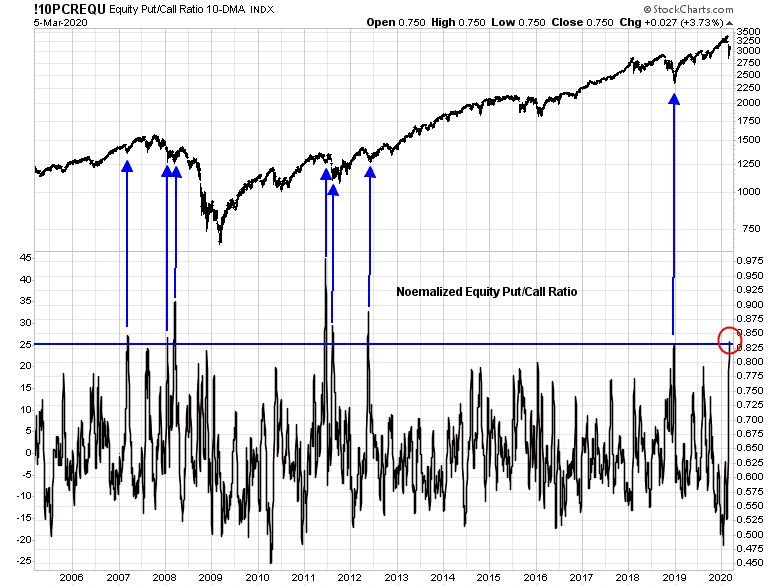 The normalized equity-only put/call ratio has spiked to levels that has marked tradable bottoms in the past.